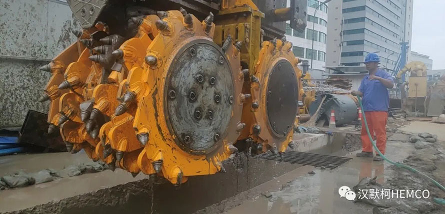汉默柯RSC双轮铣轮适用于密集底层中的挖沟,尤其适用页岩,卵石层,风化岩石,坚硬岩。2020年7月2日,汉默柯技术团队到达项目施工地,对地下连续墙施工中的铣轮性能提出优化建议,并对现场提出的问题进行了解答和改进。